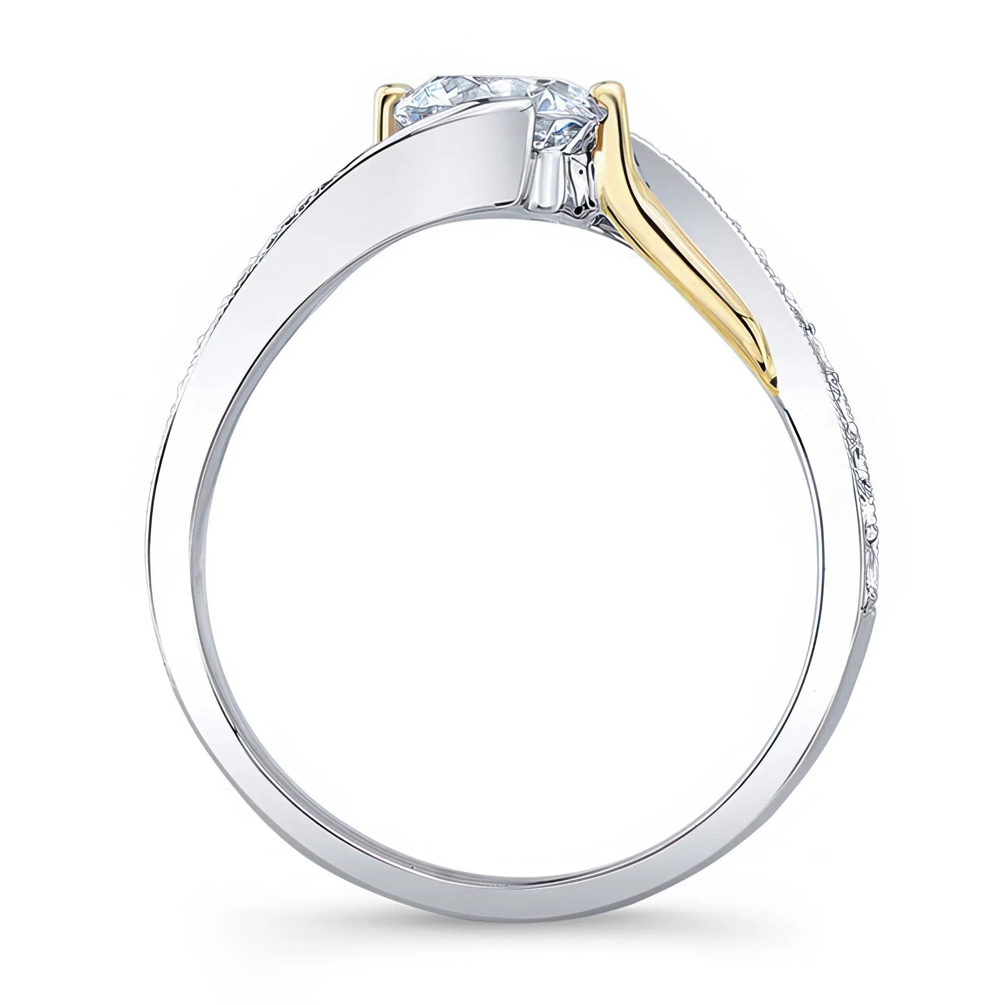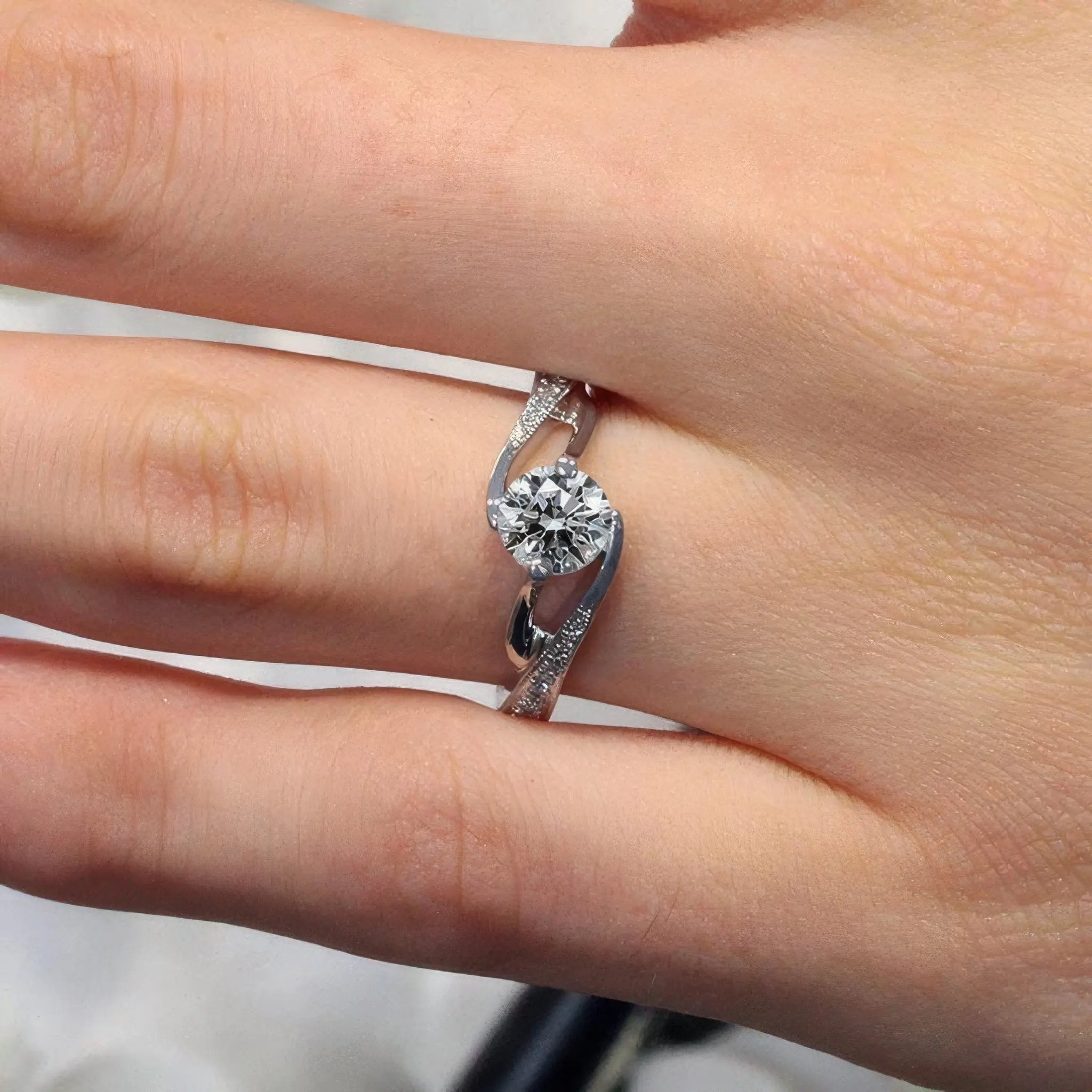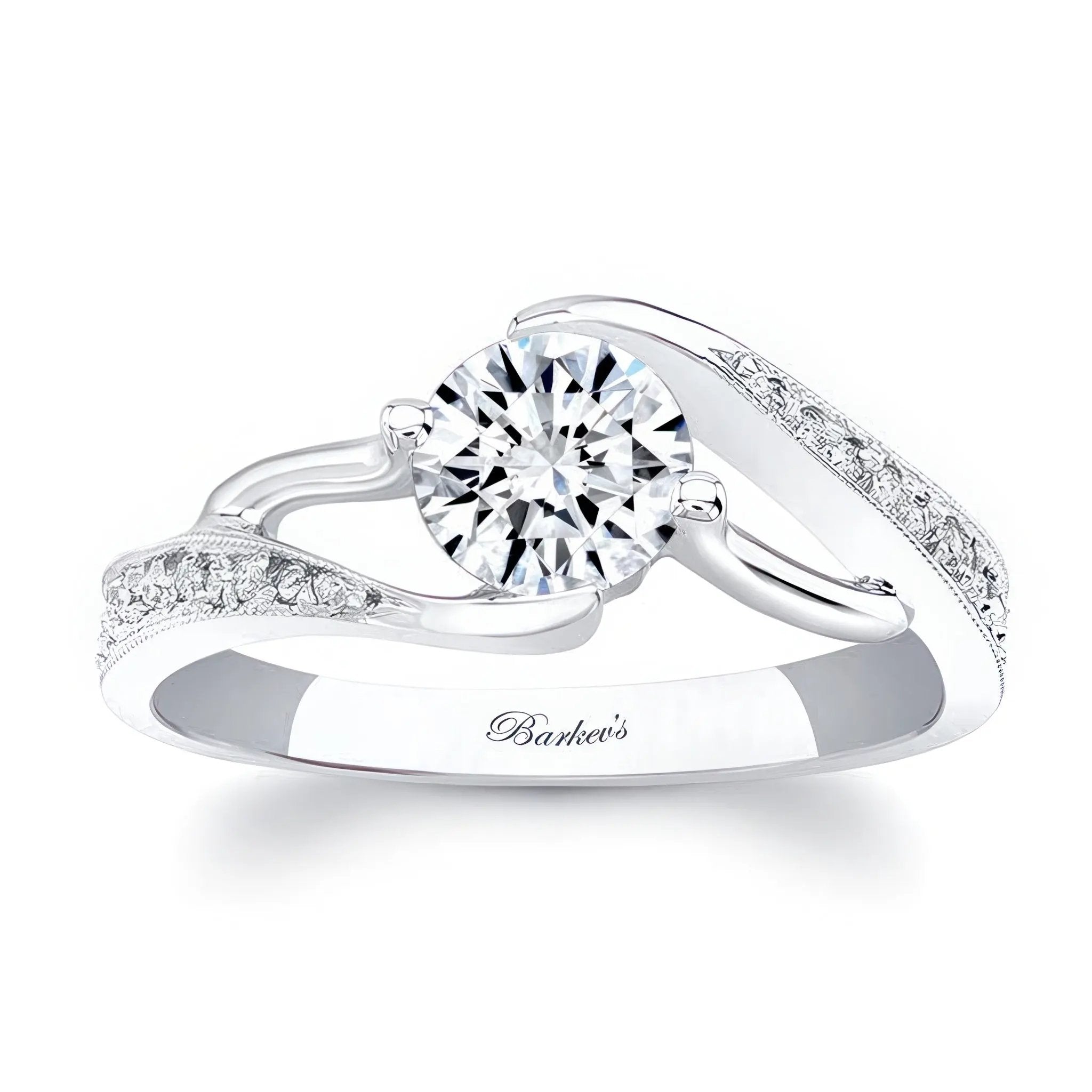 This modern bypass moissanite ring has a channel set round center with pave set diamonds on the shoulder and a milgrain finish for a touch of glam.